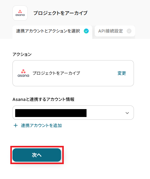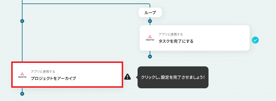 - 最後に、オペレーションでAsanaの「プロジェクトをアーカイブ」アクションを設定し、一連のタスクが完了したプロジェクトをアーカイブします。