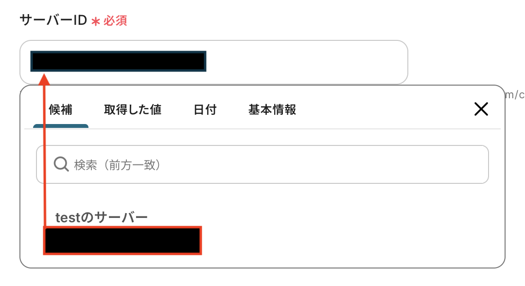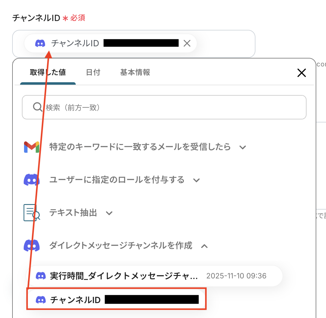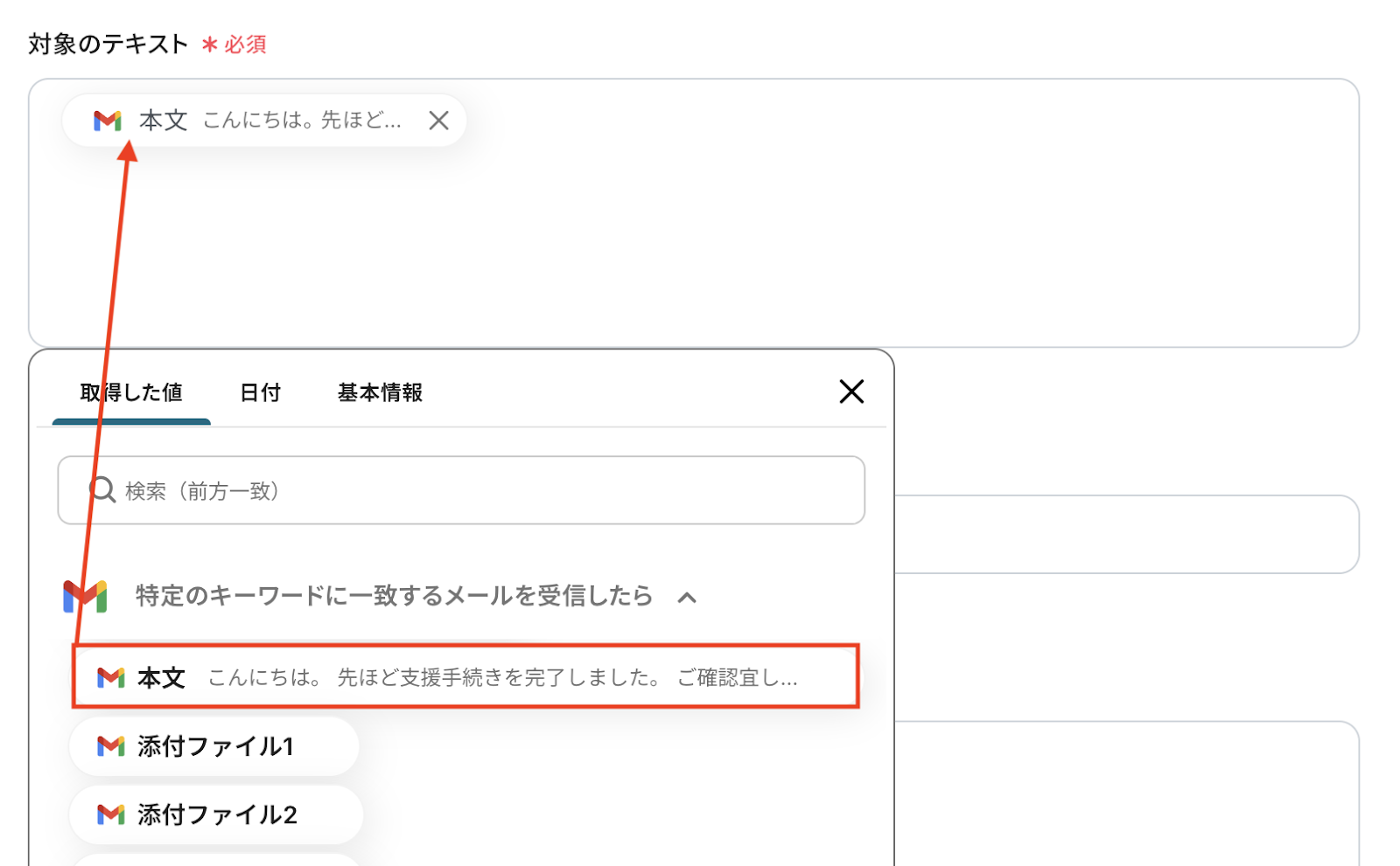 入力欄をクリックすると、前のステップでGmailから取得した値が表示されるので、選択して入力しましょう。