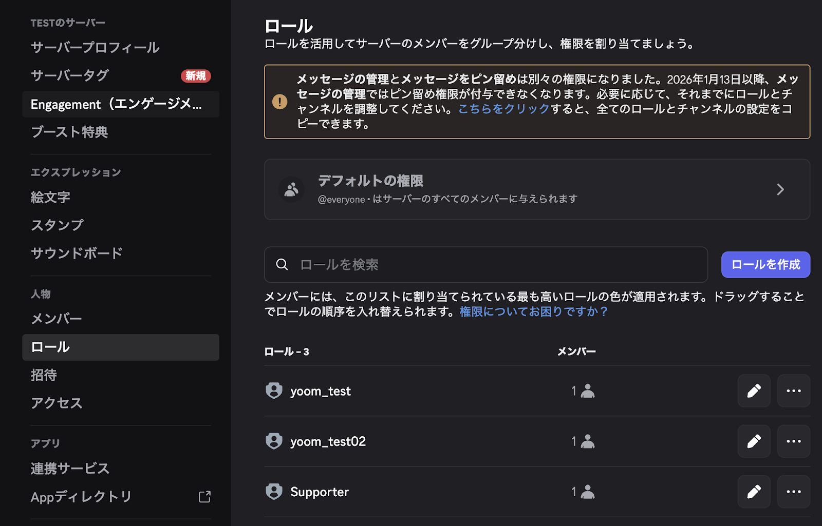 そのため、以下の画像のようにBotのロール(yoom_test)は、付与したいロール(Supporter)より上に配置してください。