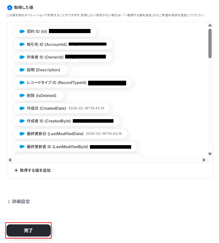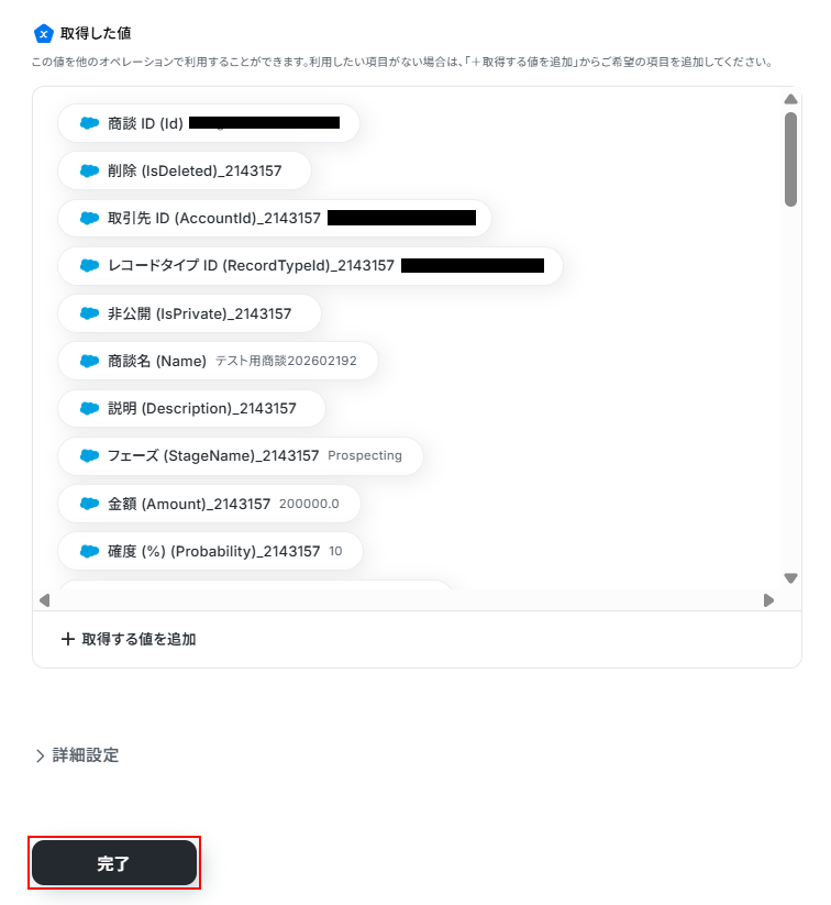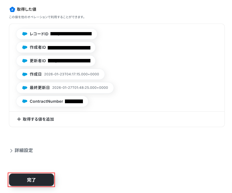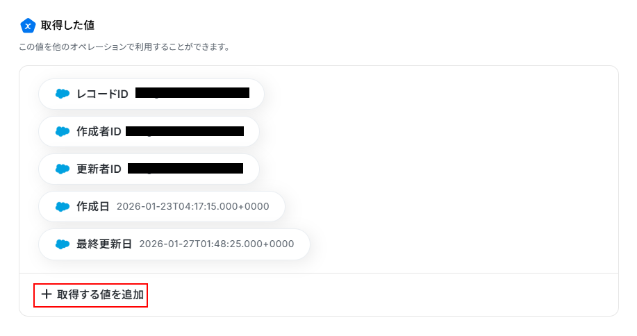 また、取得するフィールド名は自由に選択できるため、取得した値の項目内に表示されていません。