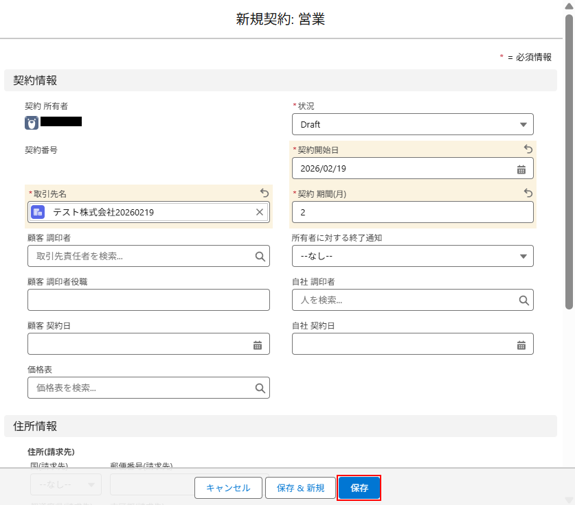 次に、Salesforceの画面に移動し、新しくテスト用の契約を登録しましょう。
