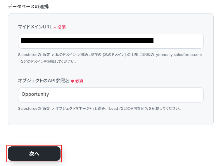 オブジェクトのAPI参照名は、今回は商談のレコードを取得するためOpportunityを選択しました。