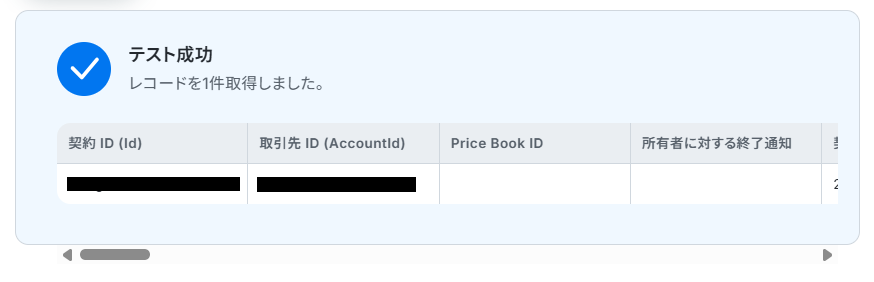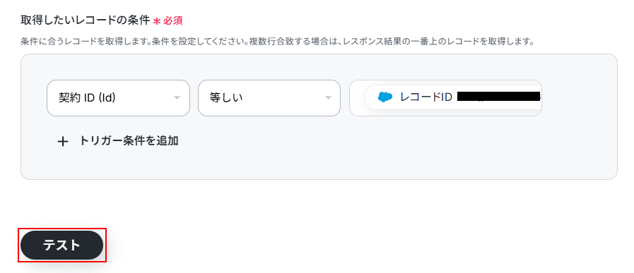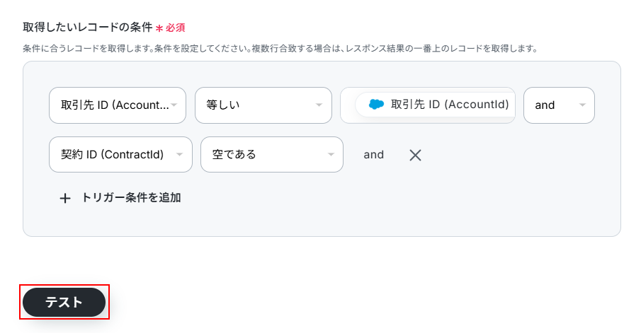 今回は以下のように、取引先IDと取得した値が等しいこと、契約IDが空であることを設定しました。