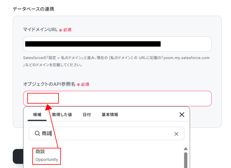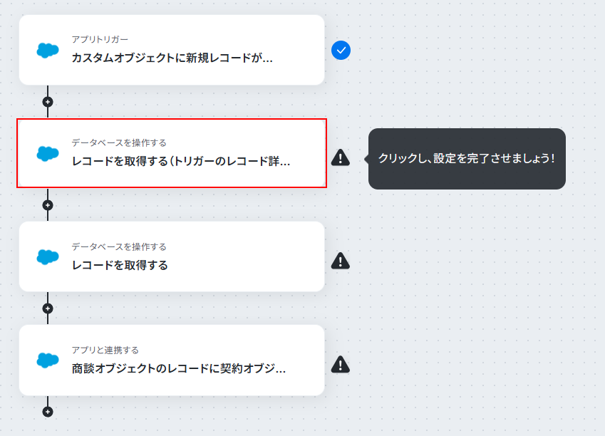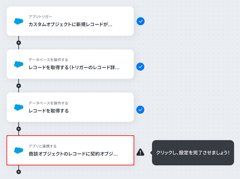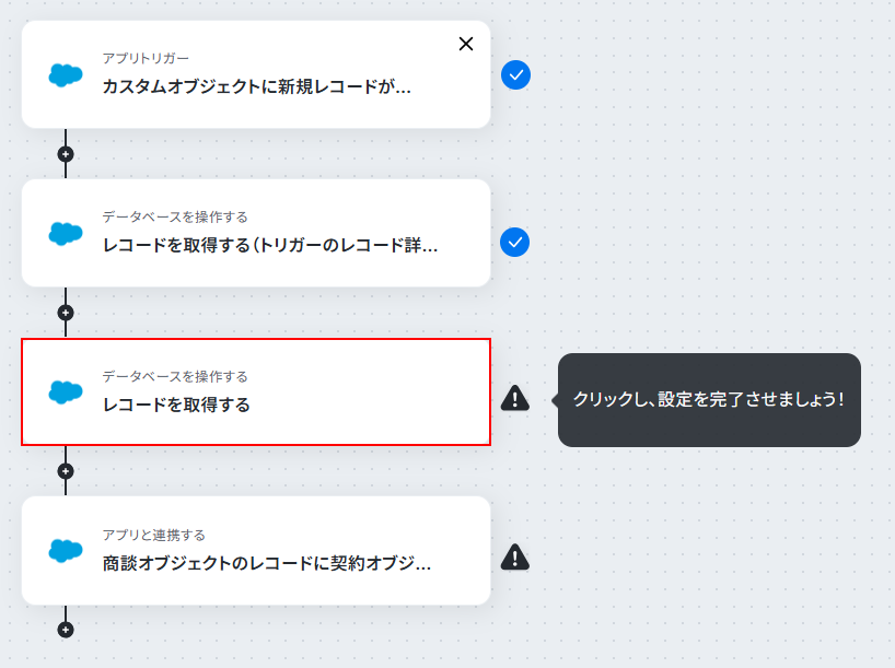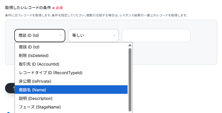 この項目では先ほど契約のカスタムオブジェクトに登録したレコードに紐づける、商談のレコードを取得します。