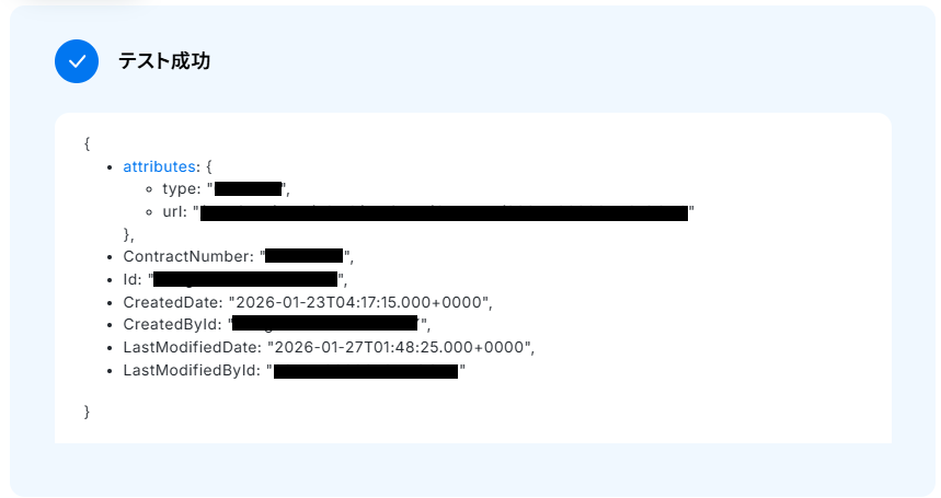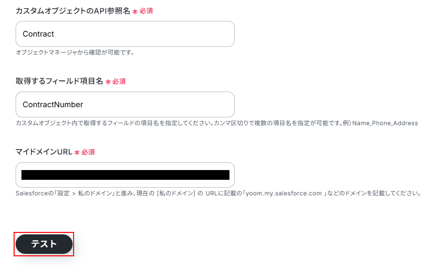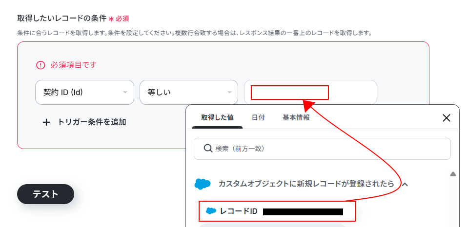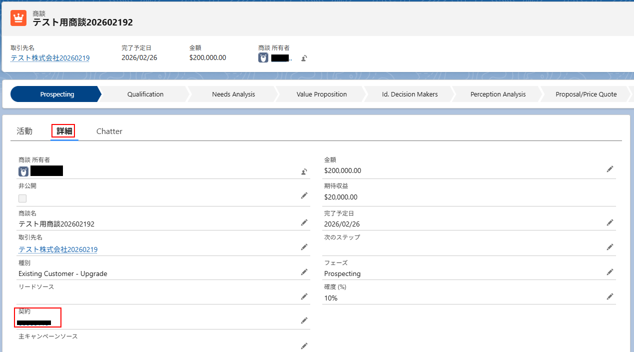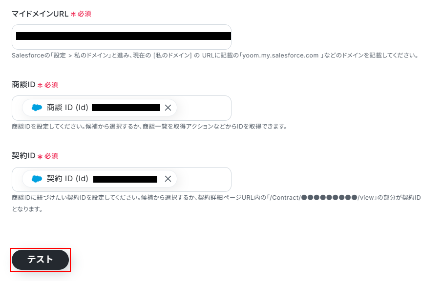 ※テストをクリックすると、実際に商談オブジェクトのレコードに契約オブジェクトのレコードを紐付けます。