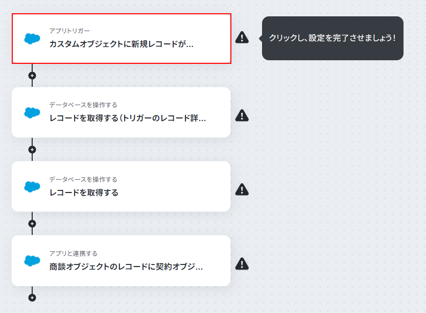 今回ご紹介するテンプレートでは、Salesforceのカスタムオブジェクトに新規レコードが登録されたら起動します。