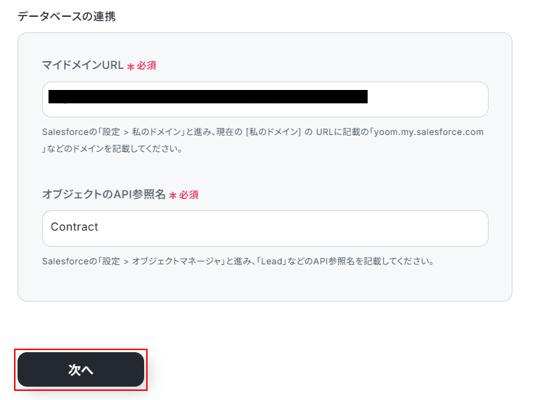 今回は契約のカスタムオブジェクトを利用するため、以下のようにContractと入力しました。