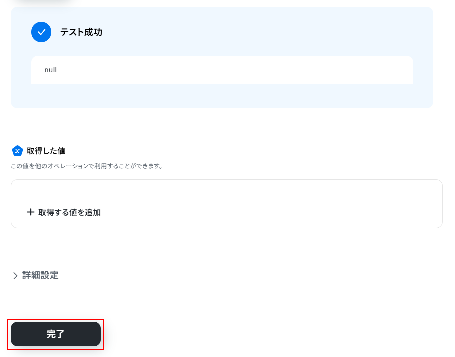 取得した値は実行した結果が設定される動的な値として利用できるため、このあとの設定でも使用します。