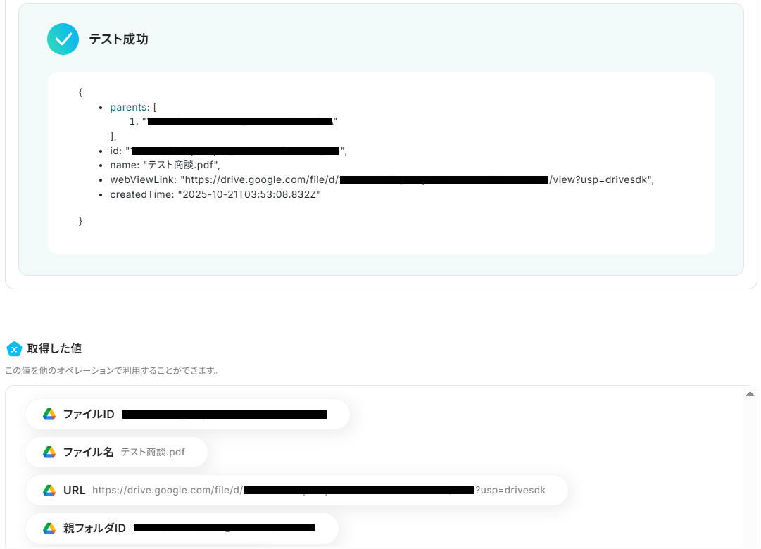ファイルIDの欄にはGoogle Driveから取得した「ファイルID」の値が予め入力されているので、そのままテストしましょう。