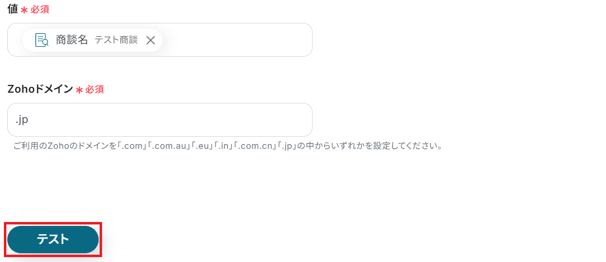 最後に、テキストボックス下部の説明通りにZohoドメインを入力してテストしてください。