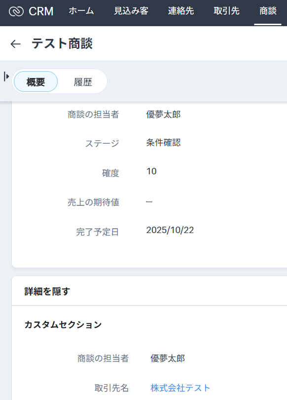 まず準備として、Zoho CRMでテスト用の商談情報を登録しておきましょう。