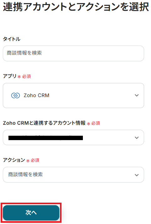 これまでのステップと同様、アクションは「商談情報を検索」のまま「次へ」をクリック。