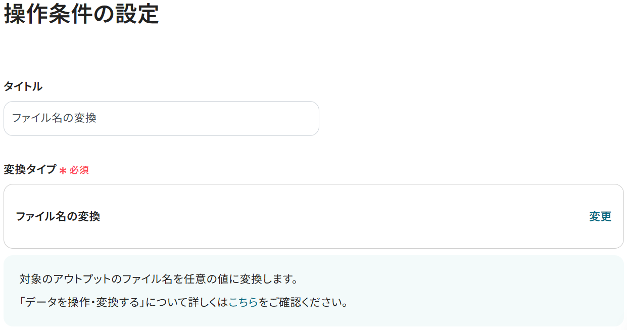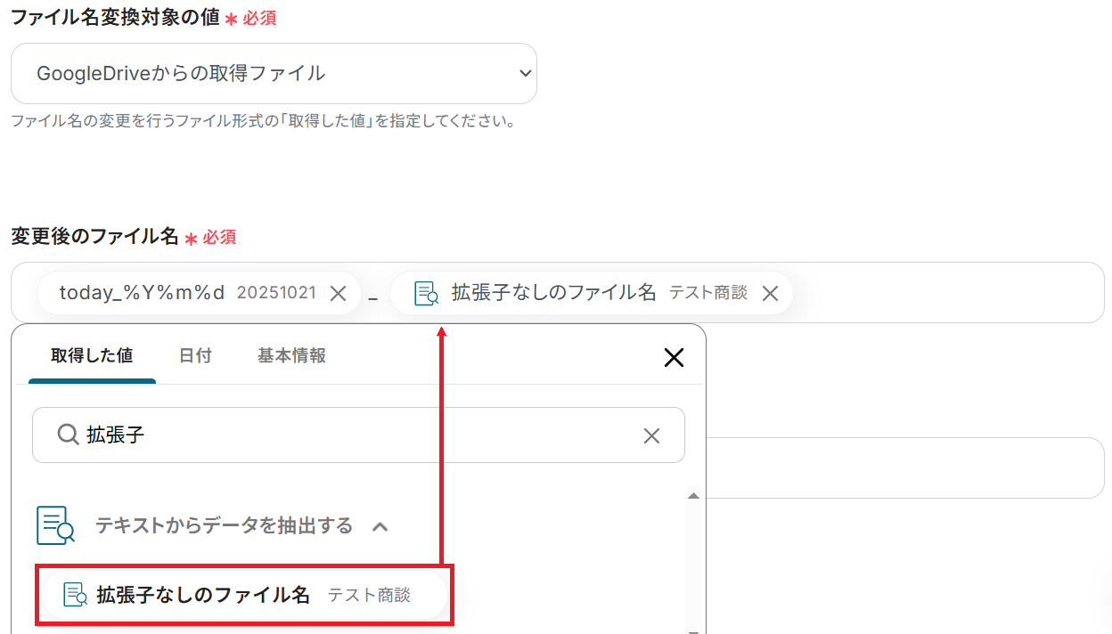 ファイル名変換後の取得した値の項目名も予め設定されているので、そのままでも任意の名称に変更しても問題ありません。