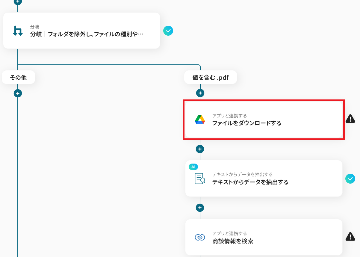 今回は、取得した値(ファイル名)が「.pdf」という値を含む場合に次のステップに進むよう設定しています。