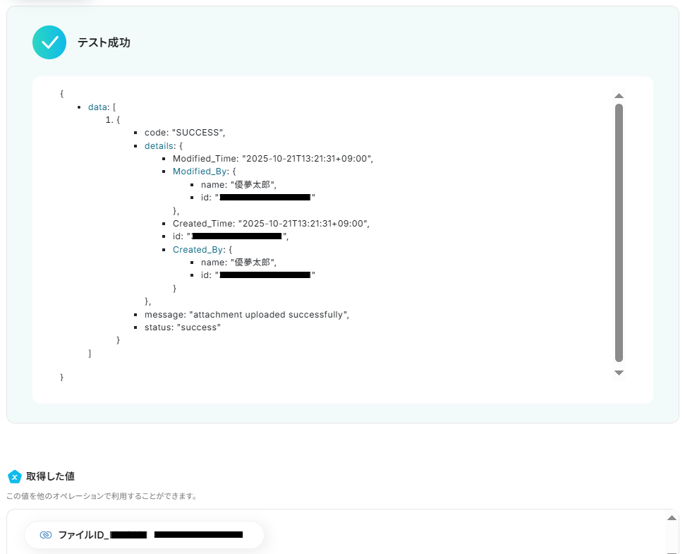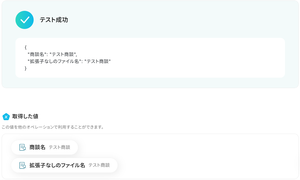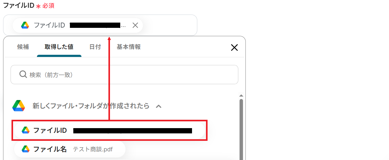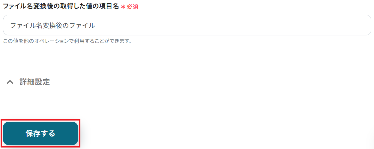 ※ステップ8で「ファイル名変換後の取得した値の項目名」を変更した場合は、ファイルの欄にその名称で表示されます。