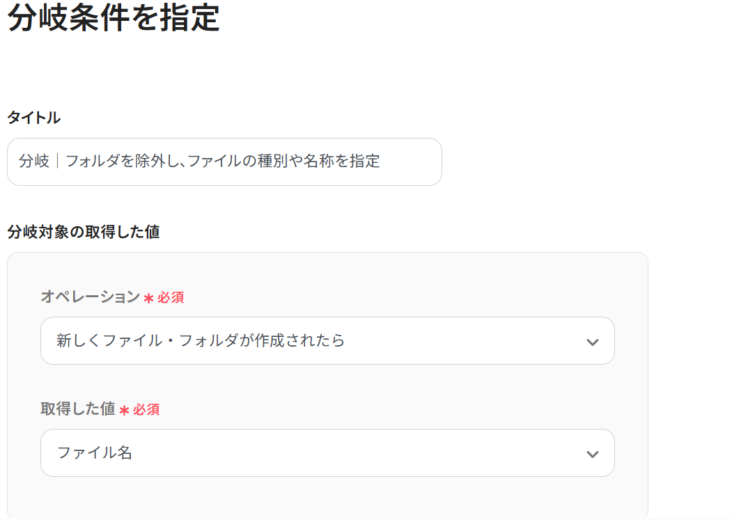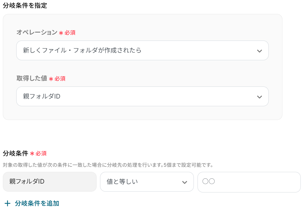 例えば「親フォルダIDが〇〇(特定の親フォルダID)と等しい場合」などと設定することで、特定のフォルダ内に格納されたファイルのみを対象とすることができます。