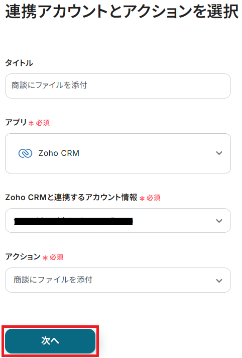 アクションは「商談にファイルを添付」のまま「次へ」をクリック。