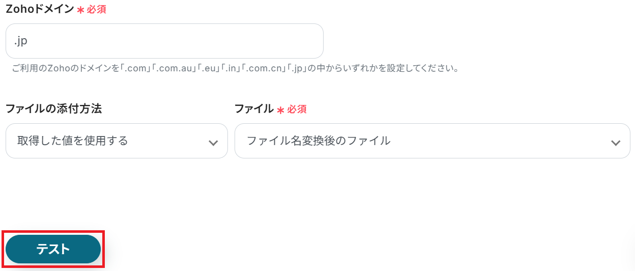 次に、ステップ7と同じZohoドメインを入力しましょう。ファイルの添付方法・ファイルは設定されている通りでOKなのでそのままテストしてください。