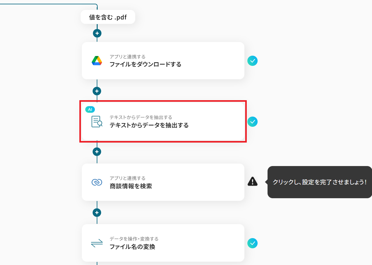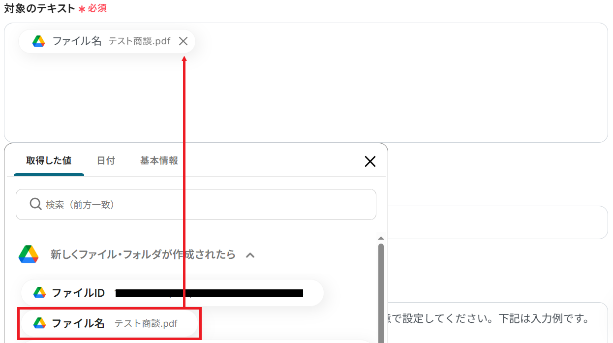 ステップ5と同じく、対象のテキストの欄にはGoogle Driveから取得した「ファイル名」の値が予め設定されているのでそのままでOKです。
