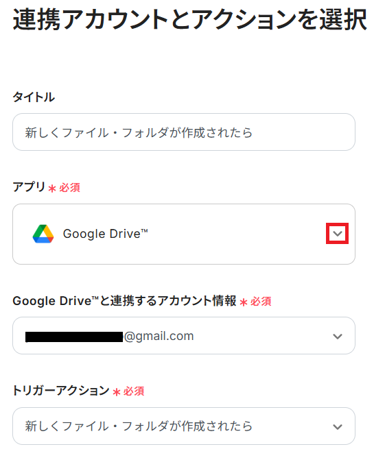 タイトルと連携するアカウント情報を任意で設定し、トリガーアクションはテンプレート通りに「新しくファイル・フォルダが作成されたら」のまま「次へ」をクリック。
