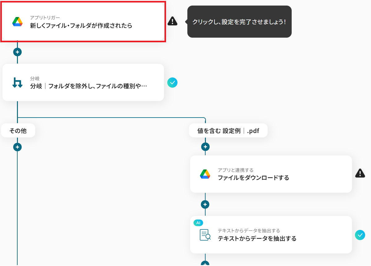 - Google Driveのトリガー設定、分岐設定、Google Driveのアクション設定、データを抽出する設定、Zoho CRMのアクション設定、ファイル名の変換設定