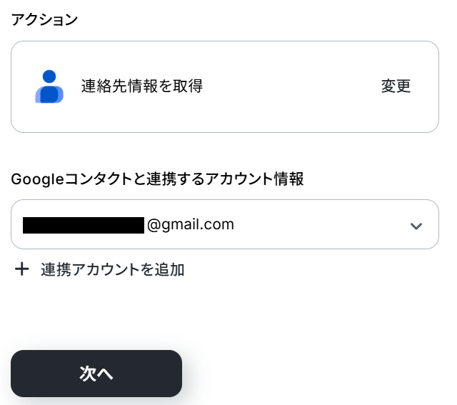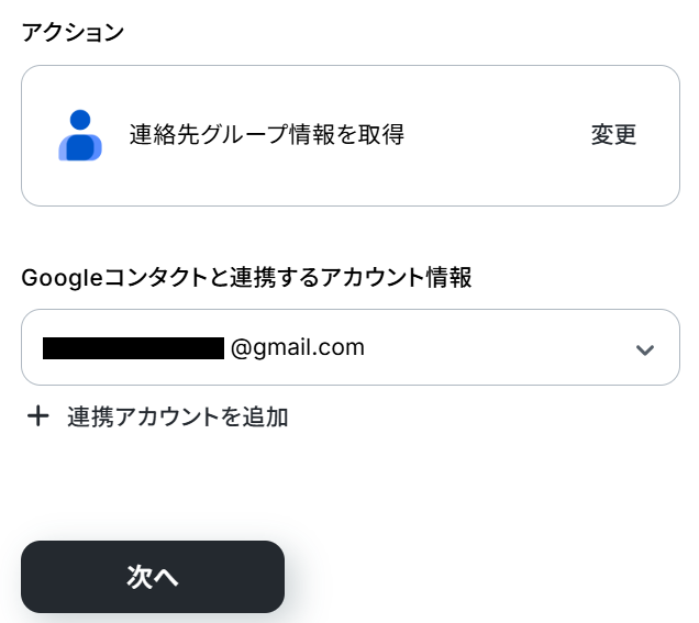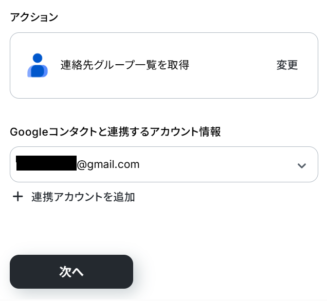 Googleコンタクトと連携するアカウントが、ステップ4で選択したものと同一であることを確認し、「次へ」ボタンをクリックしてください。