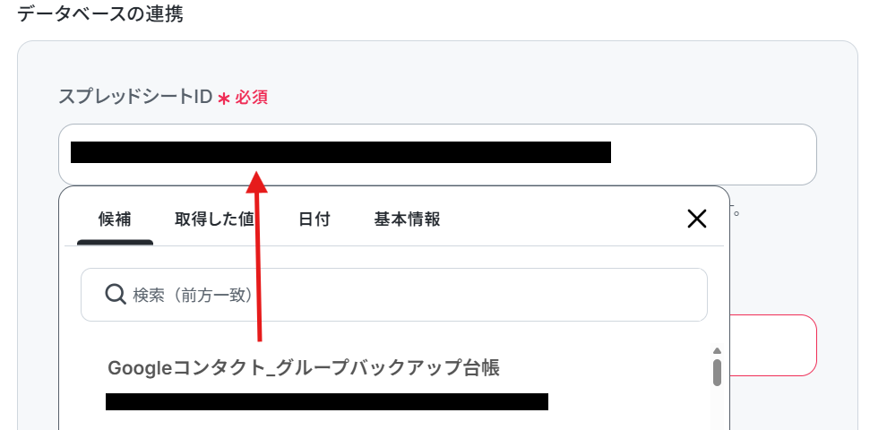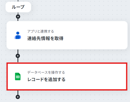 - 最後に、Google スプレッドシートのアクションを設定し、取得した連絡先情報を指定のスプレッドシートにレコードとして追加します