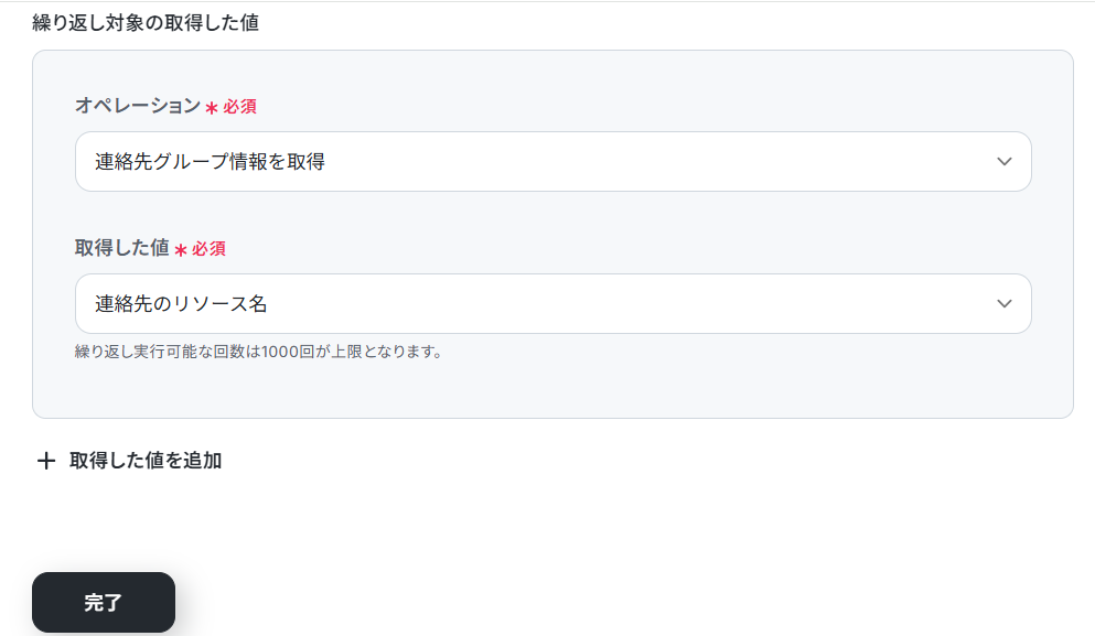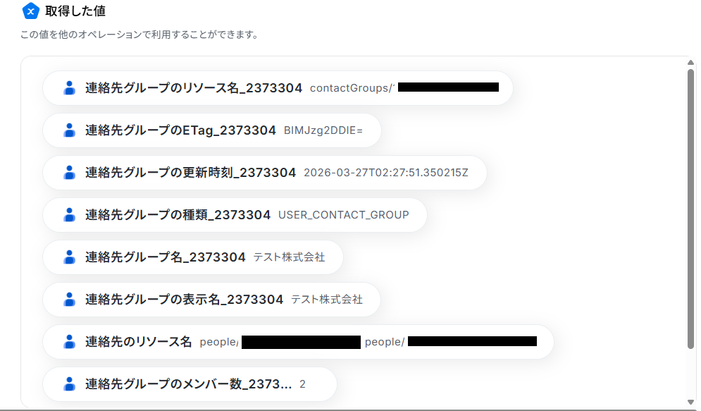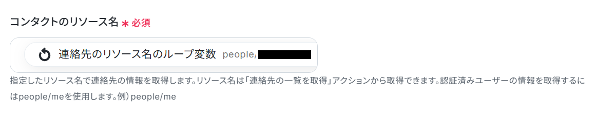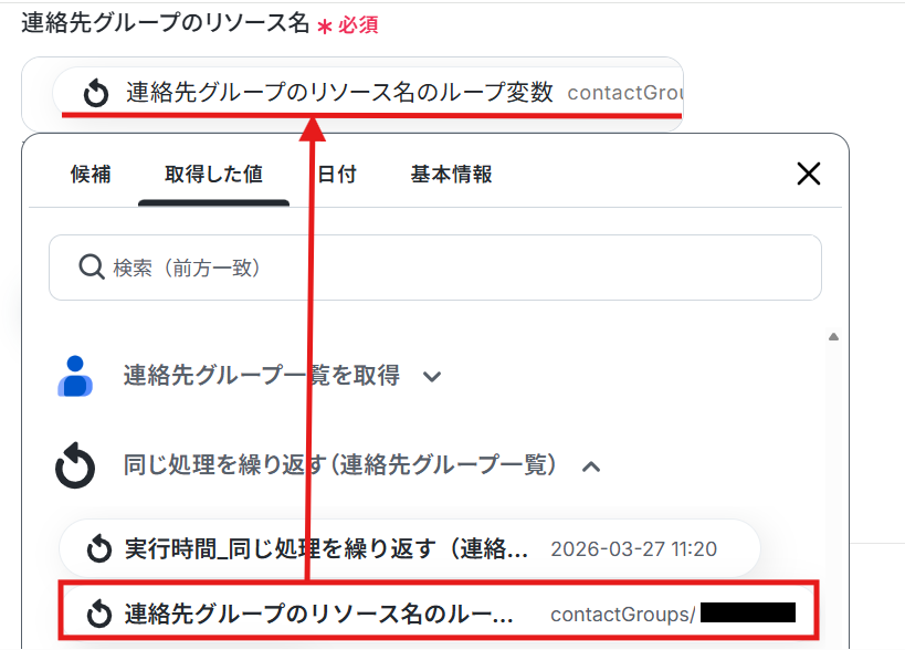 連絡先グループのリソース名は、デフォルトでステップ5で取得した「連絡先グループのリソース名のループ変数」が設定されているので確認しましょう。