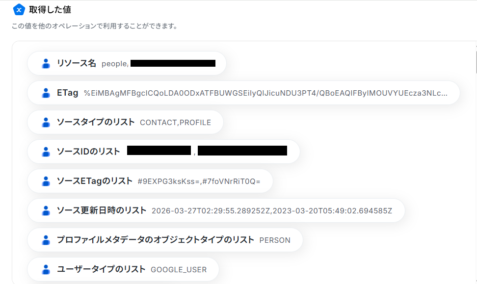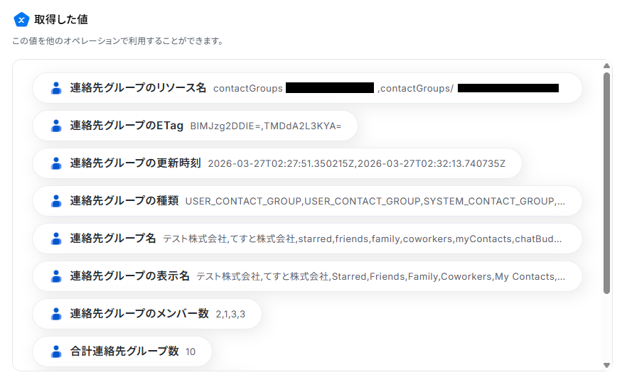 - オペレーションで、Googleコンタクトから連絡先グループの一覧を取得します