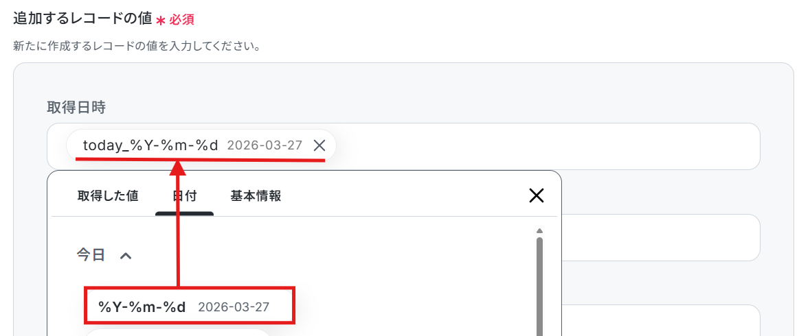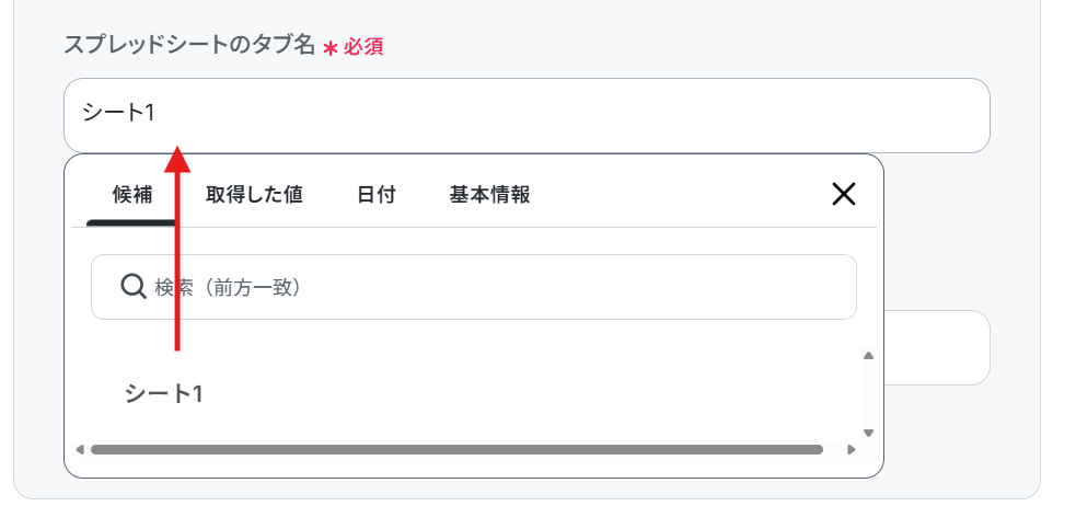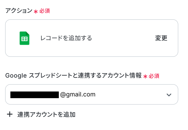 - Google スプレッドシートにレコードを追加するアクションでは、バックアップ先となる任意のスプレッドシートと、その中のシート(タブ)名を指定してください