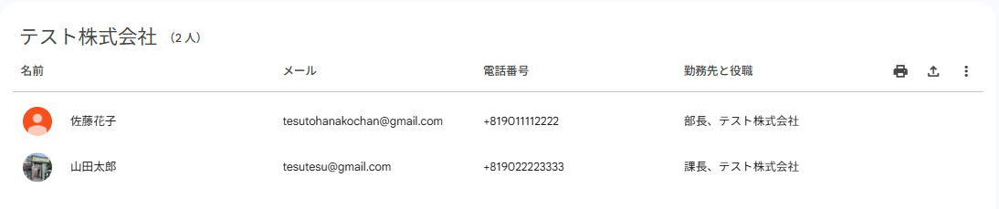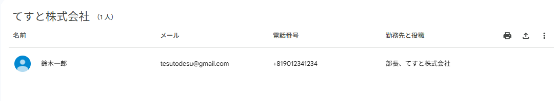 ①Googleコンタクトに、テストで使用するための連絡先を登録しておきましょう。