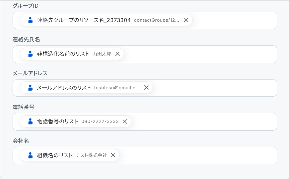 - Googleコンタクトに連絡先を作成する際、Googleフォームから取得したどの回答をどの項目(氏名、会社名、メールアドレスなど)に登録するかを任意で設定できます。