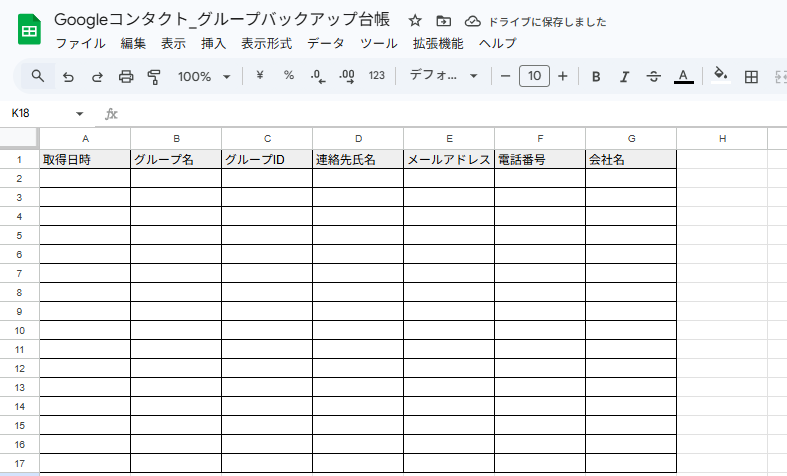 ②Google スプレッドシートに、Googleコンタクトのバックアップを取得するためのシートを作成しておきましょう。