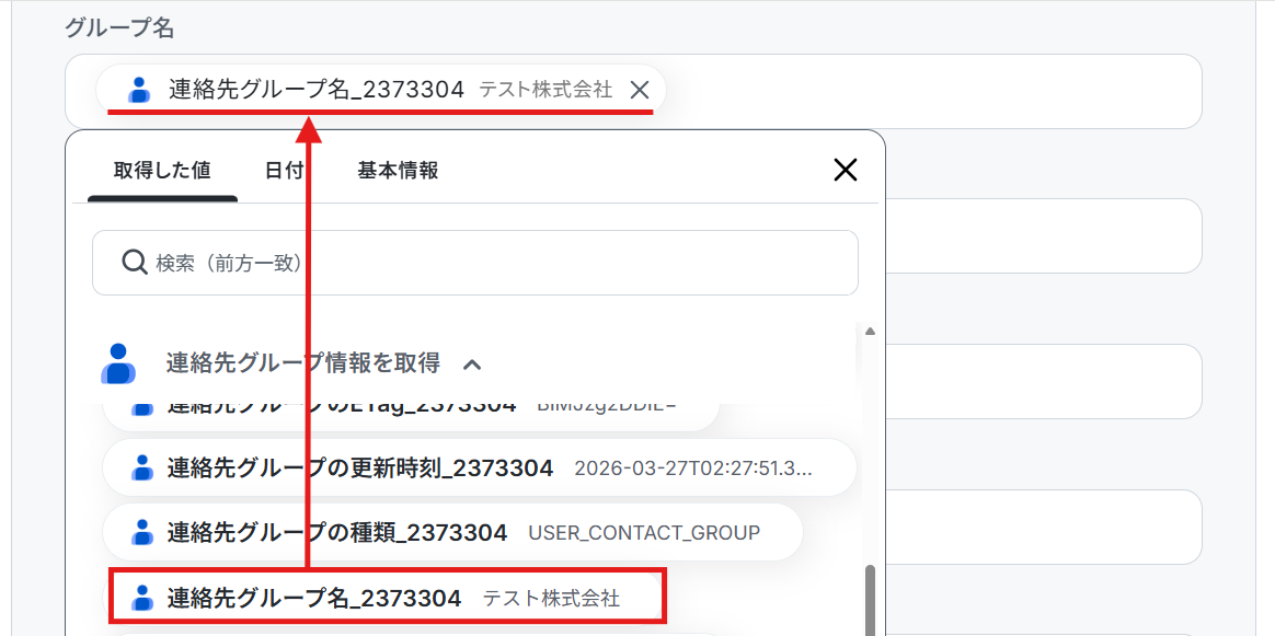 続いて、「連絡先グループ一覧を取得」という項目をクリックし設定します。