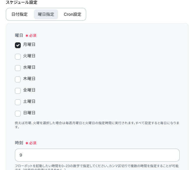 スケジュール設定では、日付指定・曜日指定・Cron設定などから、自由に起動タイミングを選択できます。