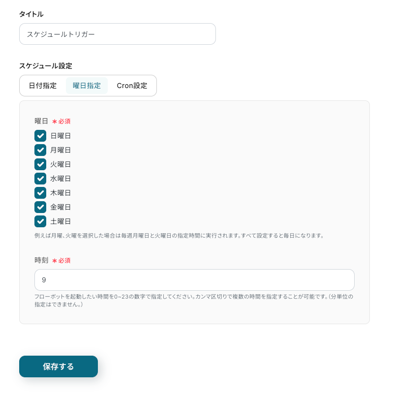 内容を確認し、「保存する」をクリックしてください。 ※「スケジュール設定」は、タブ(日付指定・曜日指定・Cron設定)から変更可能です。