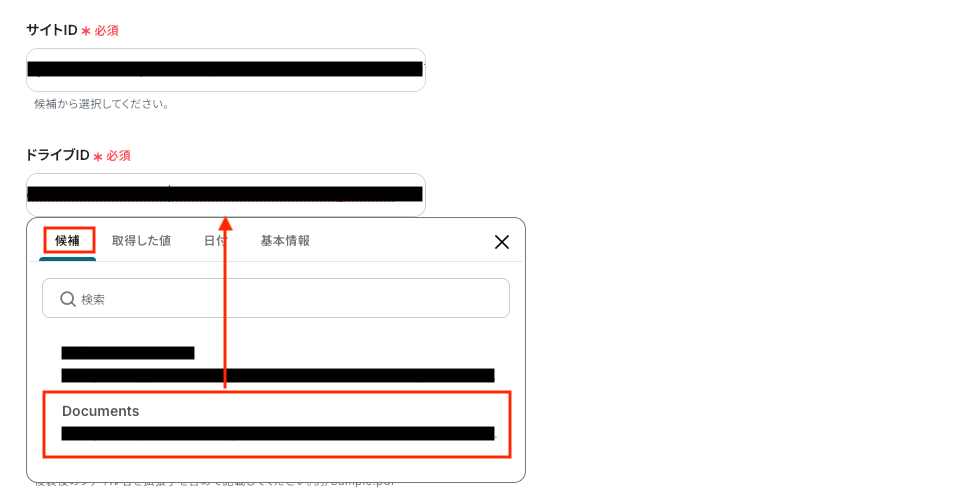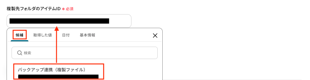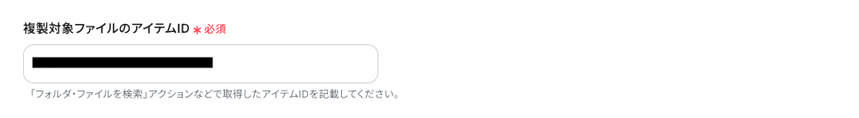「複製対象ファイルのアイテムID」は、最後の設定項目にある「複製先フォルダのアイテムID」をクリックして表示される候補の中から指定し、IDをコピー&ペーストしてください。
