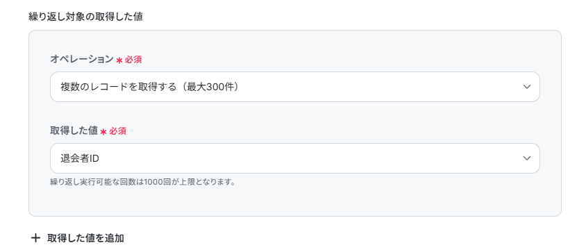 ※「同じ処理を繰り返す」オペレーションを使う場合は、チームプランまたはサクセスプランが必要です。フリープラン・ミニプランだと、設定してもエラーになってしまうのでご注意ください。