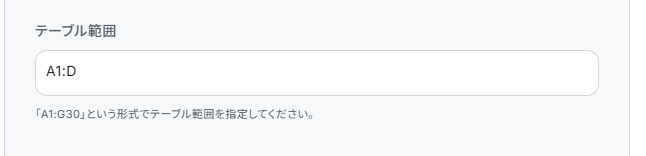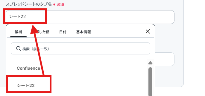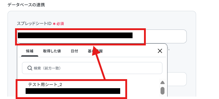 データベースの連携を行います。「スプレッドシートID」「スプレッドシートのタブ名」は候補より上記シートを選択します。