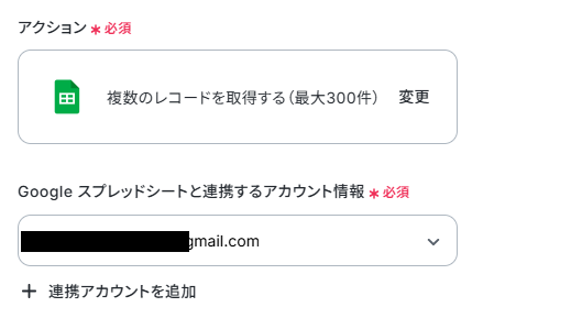 - 次に、オペレーションでGoogle スプレッドシートの「複数のレコードを取得する」アクションを設定し、削除対象のリストを取得します。