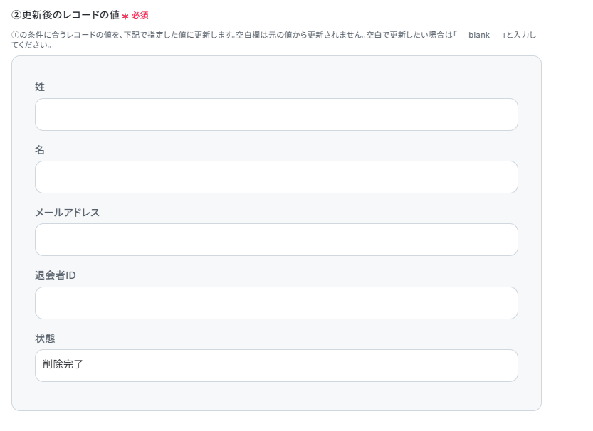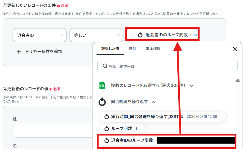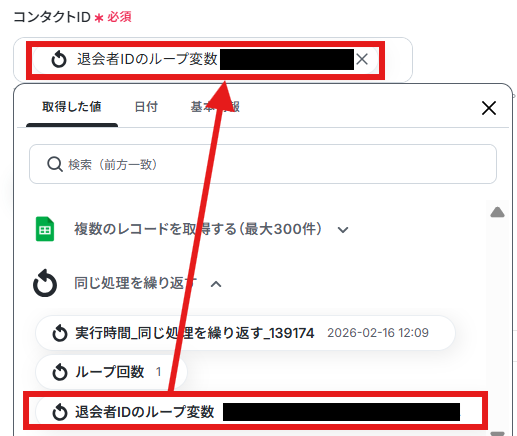 「コンタクトID」に前ステップの取得した値から「退会者IDのループ変数」を入力します。
