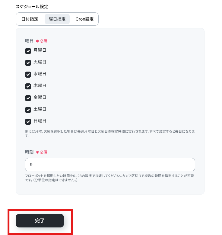 - スケジュールトリガーの設定では、毎日9時に実行するなど、フローを起動する任意の時間帯を設定してください。