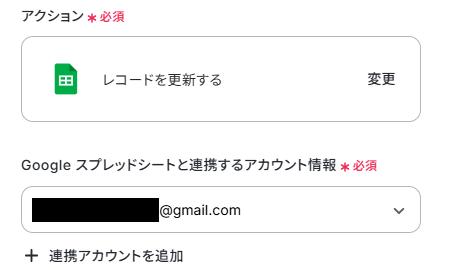 - 最後に、オペレーションでGoogle スプレッドシートの「レコードを更新する」を設定し、処理済みであることが分かるようにステータスなどを更新します。