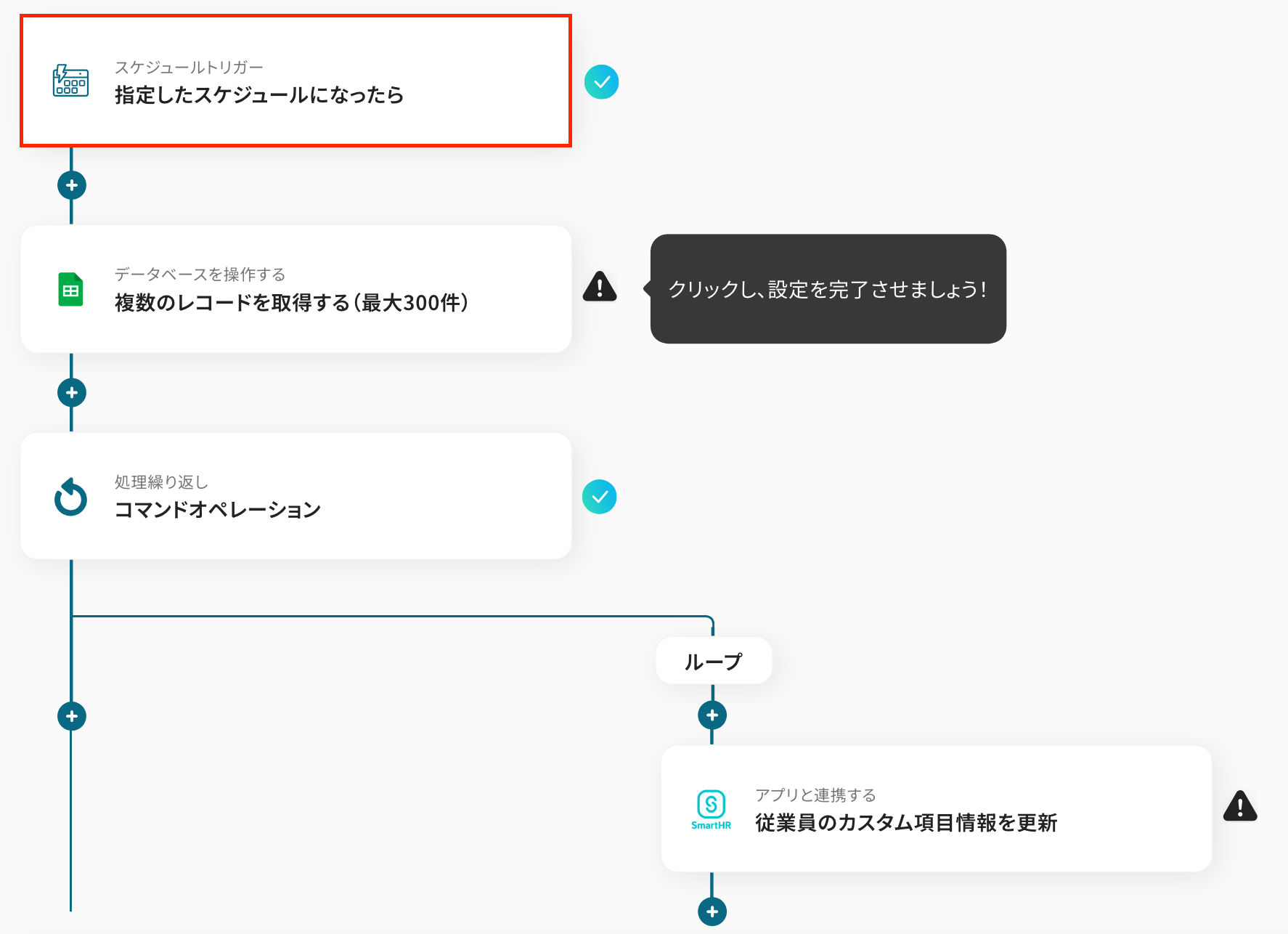 ここから「Google スプレッドシートからSmartHRの従業員カスタム項目を一括更新する」フローの設定をしていきます!