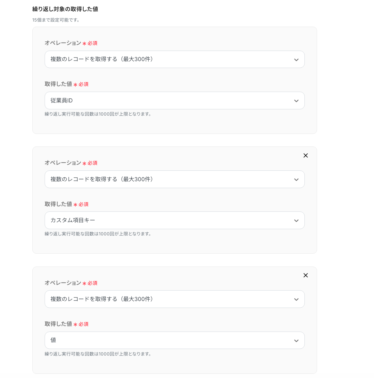 ここでは、繰り返し処理を設定することで、Google スプレッドシートなどから複数の情報を受け取った際に、それらの情報(「繰り返し対象で取得した値」)を使って従業員カスタム項目を自動で順次更新できるようにします。
