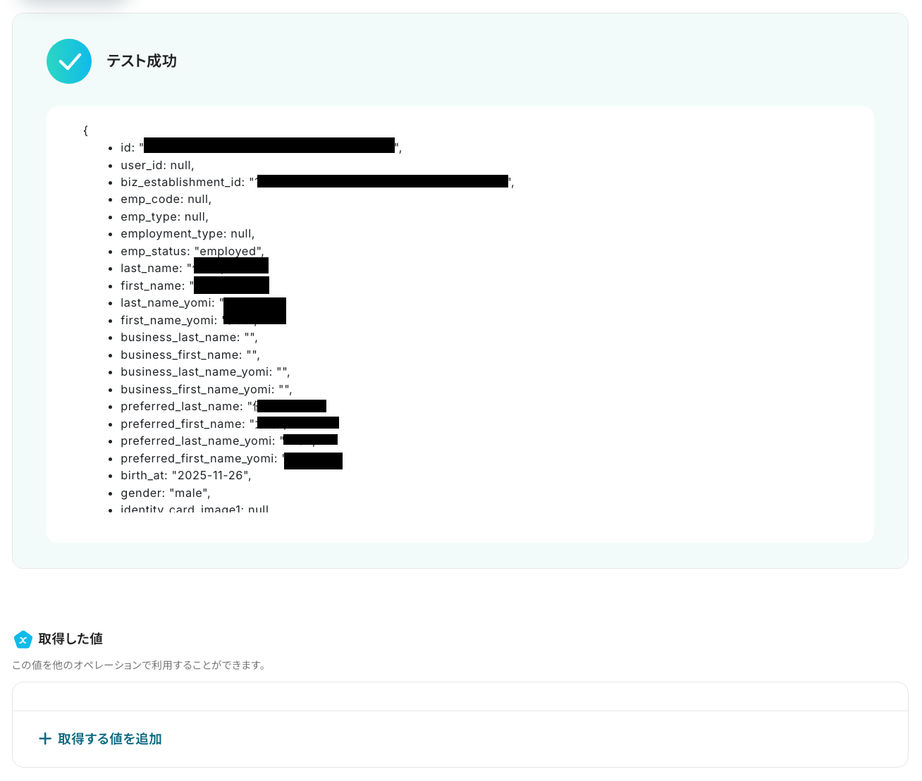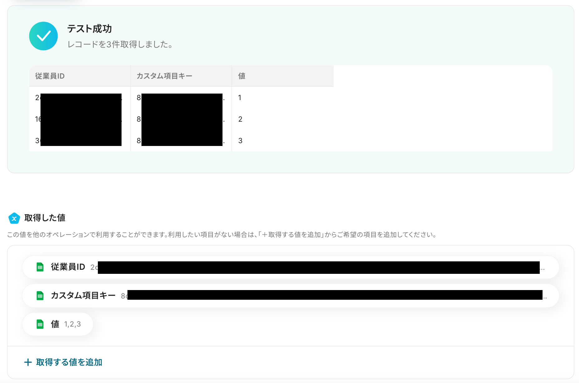 「取得した値」は、先ほどのステップで取得した「従業員ID」・「カスタム項目キー」・「値」を設定しましょう!