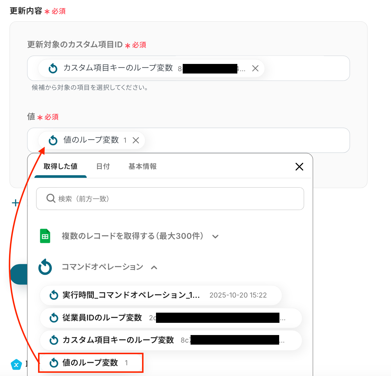 「更新対象のカスタム項目ID」と「値」は、入力欄をクリックして表示される取得した値から選択して設定してください。