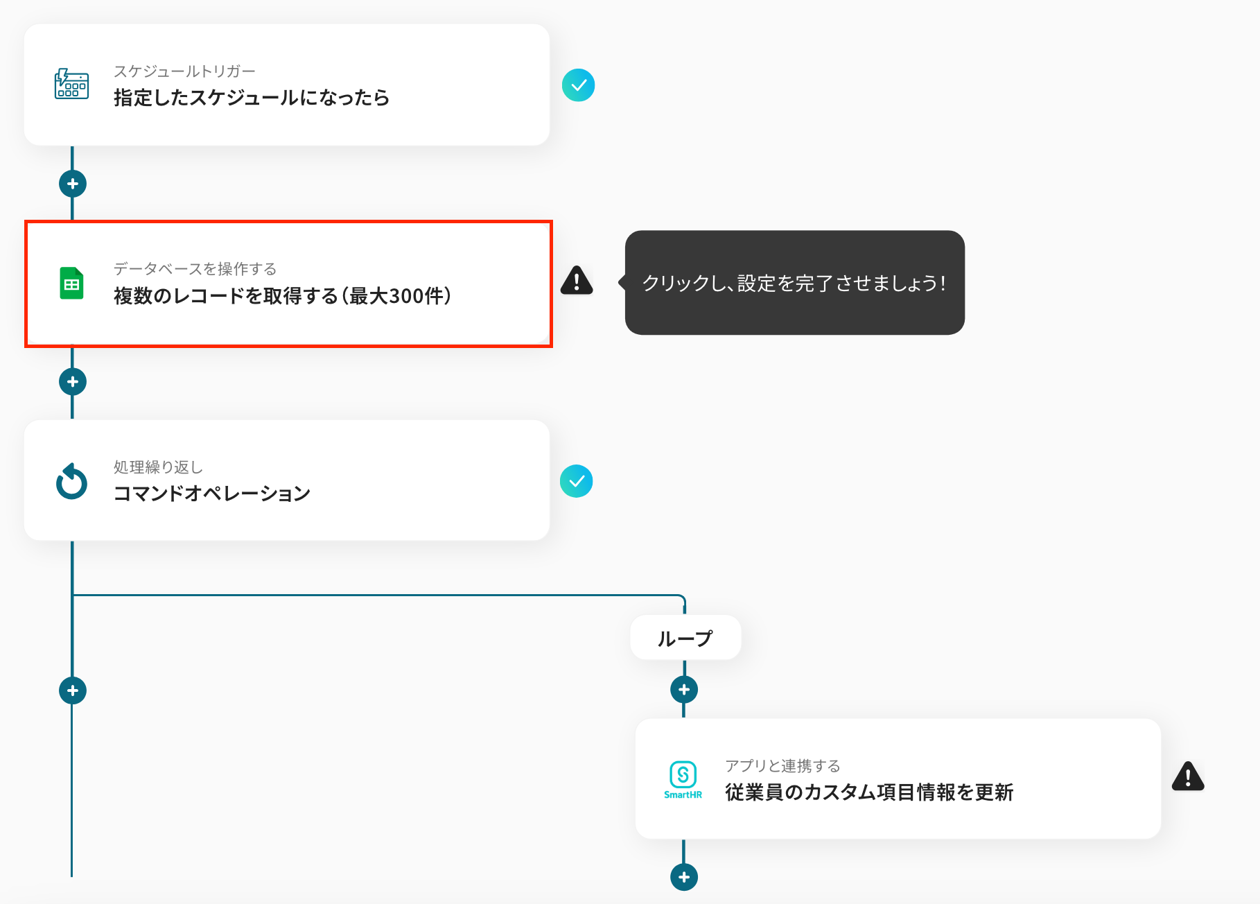 ここでは、Google スプレッドシートから複数のレコードを取得する設定を行います。