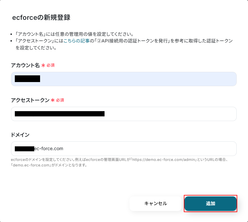 表示内容を確認したら、アカウント名、アクセストークン、ドメインを設定します。