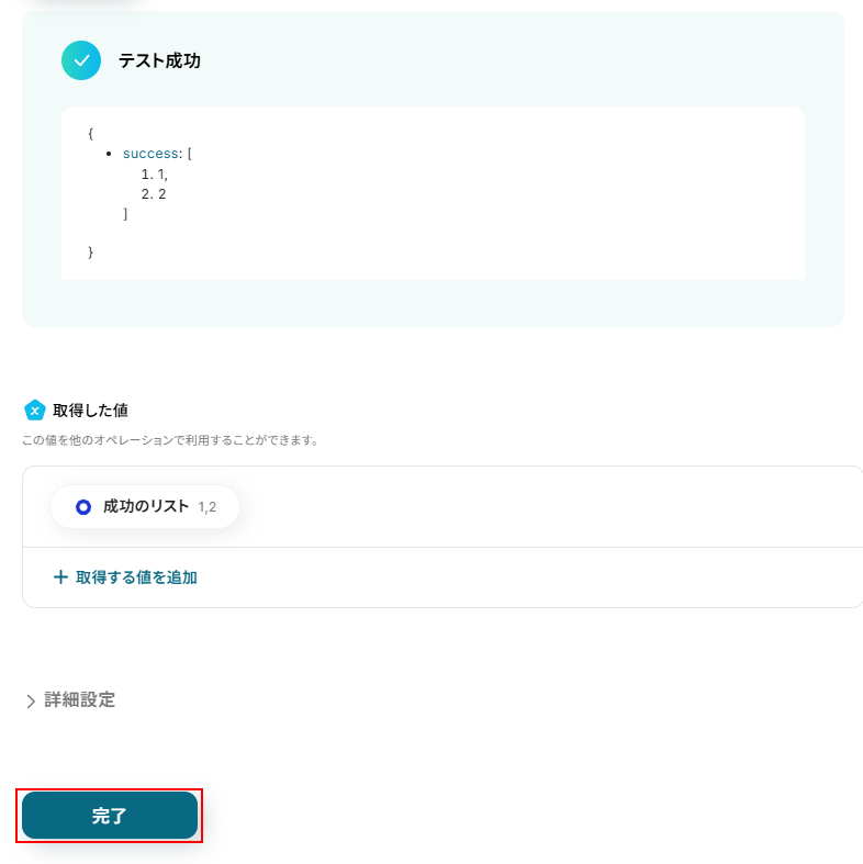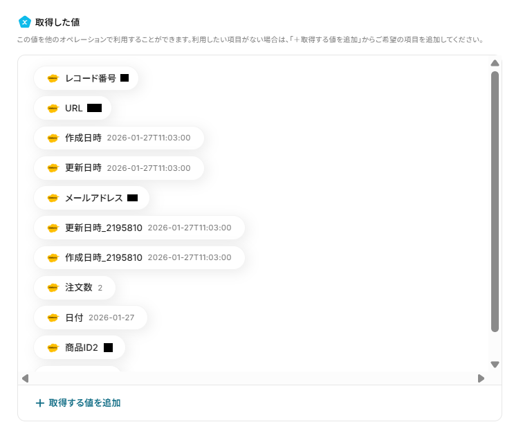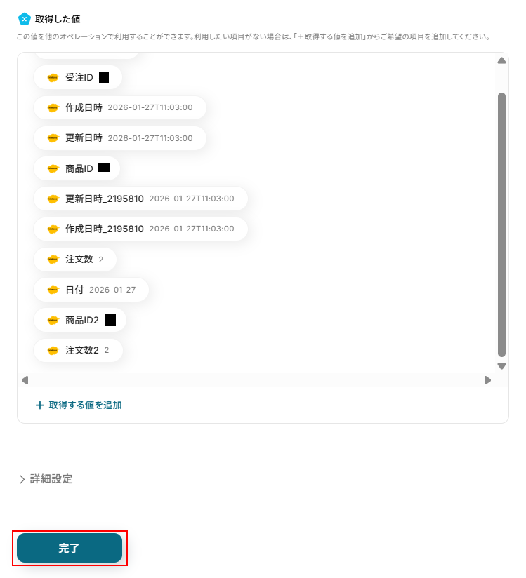 取得した値は実行した結果が設定される動的な値として利用できるため、このあとの設定でも使用します。